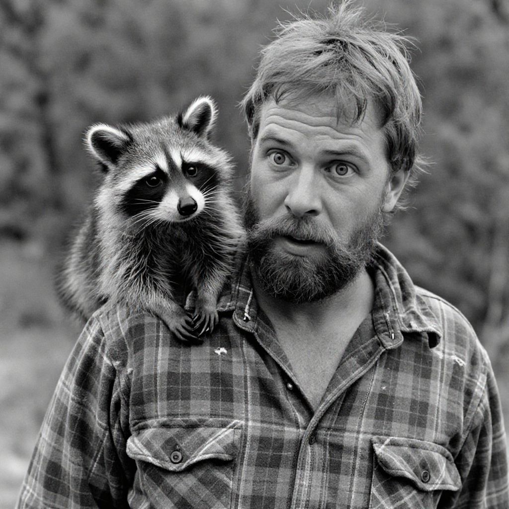 Candid portrait of a rugged outdoorsman, sporting a bushy beard and worn flannel shirt, as he shares a humorous moment with an endearing raccoon companion perched on his shoulder, captured in timeless black & white film grain, soft focus, natural light, rustic setting, whimsical atmosphere. Man has masculine face and piercing eyes