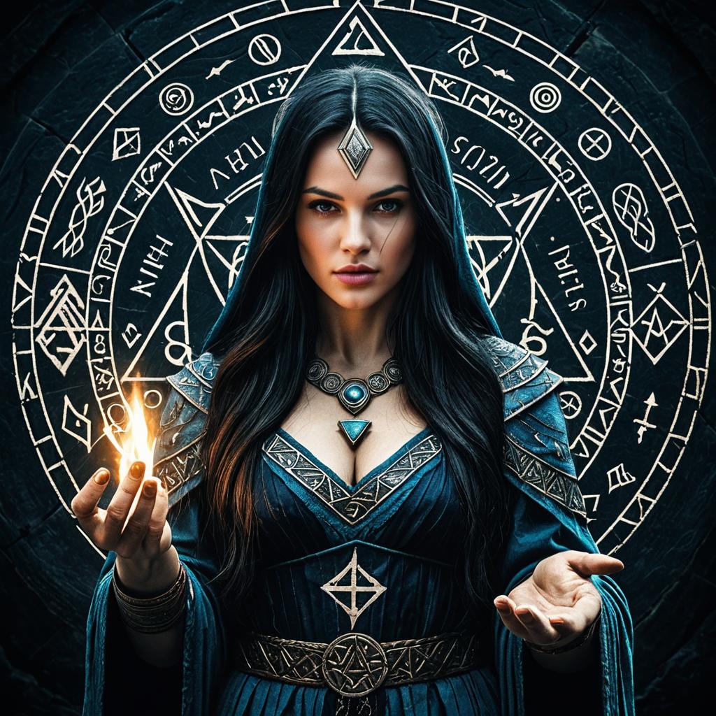 Ancient Mystic Woman with Glowing Amber Eyes in Moonlit Cave