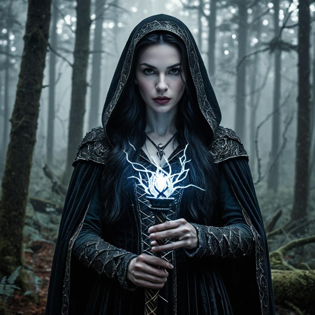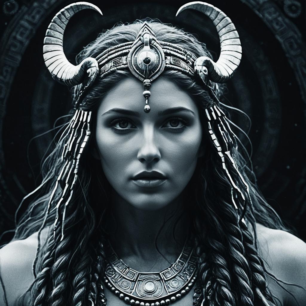 Monochrome portrait: ancient mystic with glowing amber eyes and dark charcoal lips. Centered in a surreal hazy moonlit cavern, stark contrasts, ethereal shadows. Hyper-detailed, visionary composition blending reality and illusion. Cinematic allure, emotional depth.