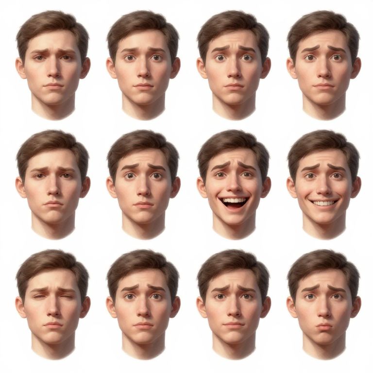 Facial expressions drawing reference collection illustrating a sequence of emotional transitions on a single face, from neutrality to extreme happiness or sadness, smooth gradient shadows and highlights, detailed anatomical accuracy, aimed at useful reference for artists.