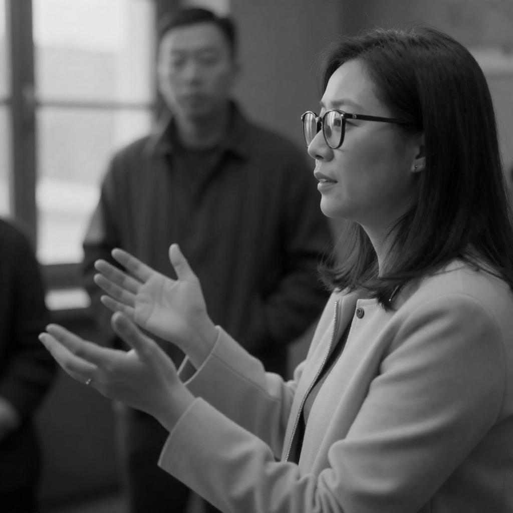 Black-and-White Woman Gesturing in Interior