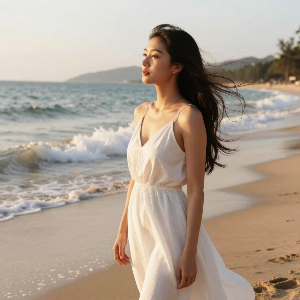 Pretty Filipino woman in a serene beach setting during golden hour, wearing a flowing white dress, waves gently lapping on the shore, soft breeze moving her hair, peaceful ambiance, detailed photorealistic style with warm light