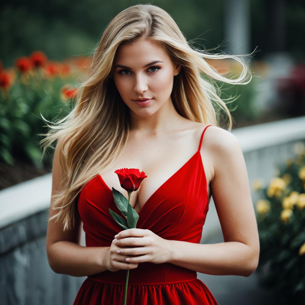 Red dress luxury,1girl, dress, solo, flower, red dress, realistic, holding flower, blonde hair, blurry, breasts, blurry background, looking at viewer, holding, long hair, sleeveless, brown hair, cleavage
