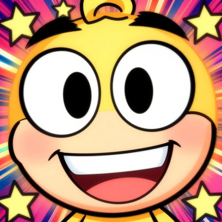 Close-up of a big face cartoon character, featuring oversized eyes and a wide smile, rendered in a comic book style with bold outlines, lively color palette, and a dynamic background full of stars and swirls.