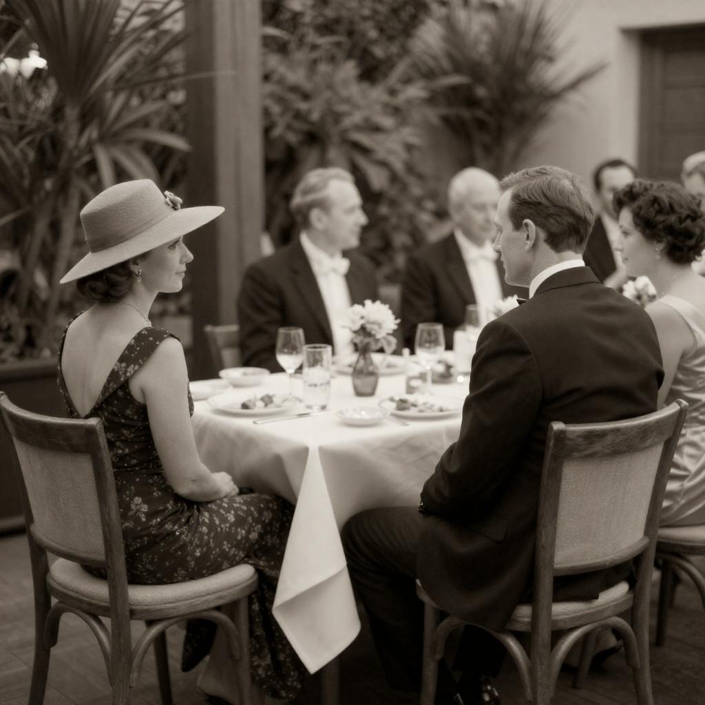 Sepia-toned photograph of an elegant dinner party. A woman in a wide-brimmed hat and dark dress sits beside a man in a suit at a table with a white cloth. Other guests, also in formal attire, sit at nearby tables. Potted plants and wooden pillars are in the background.
