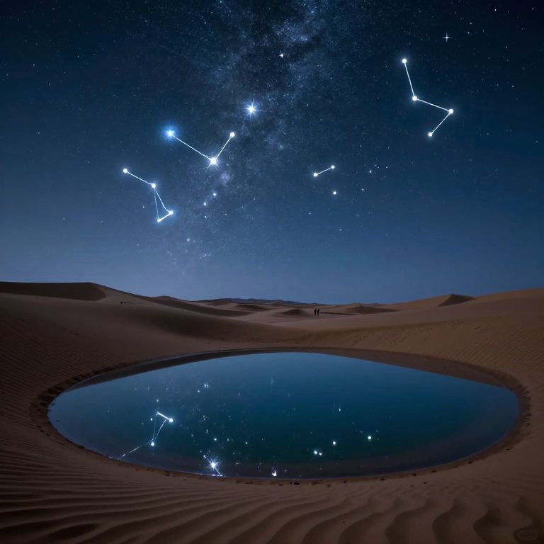 Photograph of a desert night scene featuring a circular waterhole in the foreground, reflecting the starry sky. The Milky Way galaxy stretches diagonally across the dark blue sky, with bright stars and constellation lines prominently visible. Ripples in the waterhole create a mirror-like surface. Sand dunes with ridged textures surround the waterhole, extending into the background. The scene is tranquil, with the starlight illuminating the desert landscape.