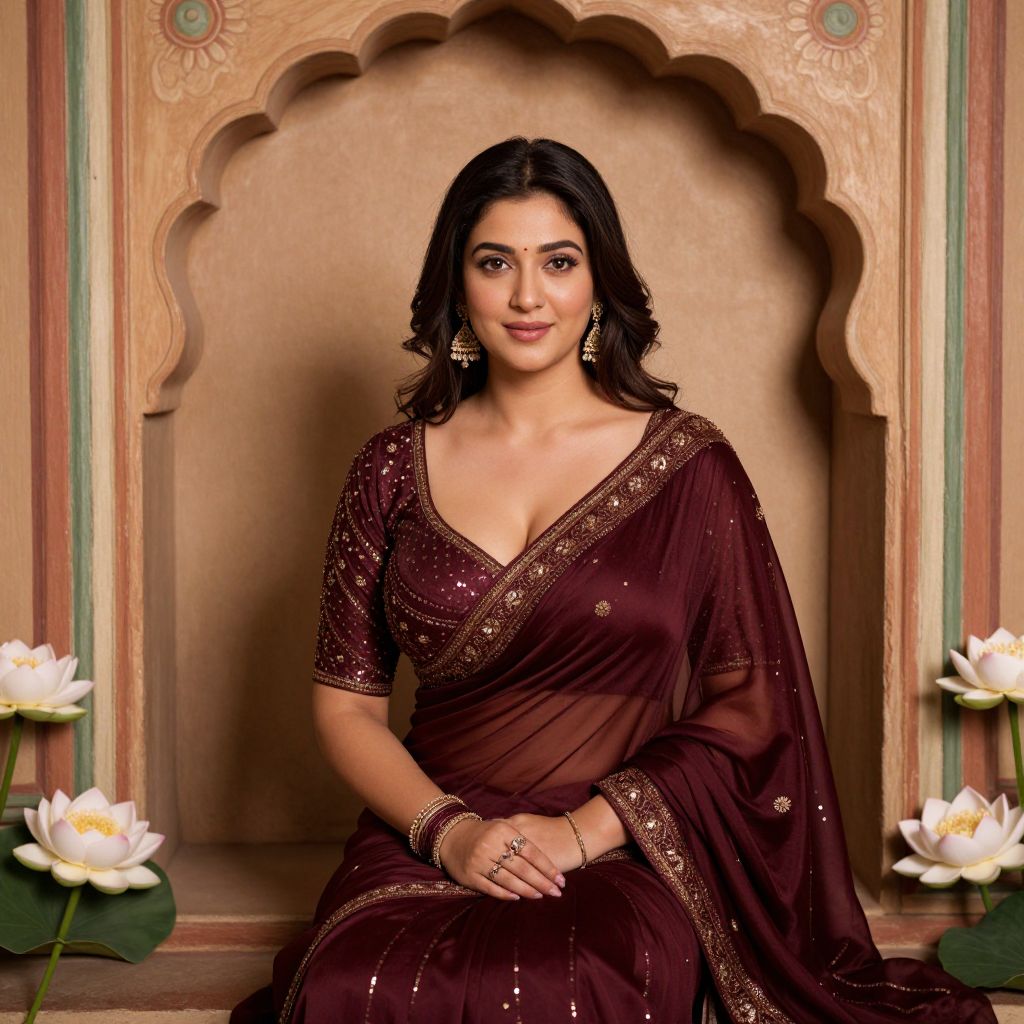 A regal-looking South Asian woman with high cheekbones, a gentle smile, and soft brown eyes wearing an intricately designed maroon Desi look saree with zari work, sitting in a vintage Indian bungalow under a painted archway with lotus flowers arranged around her.. The woman has big breasts and cute face