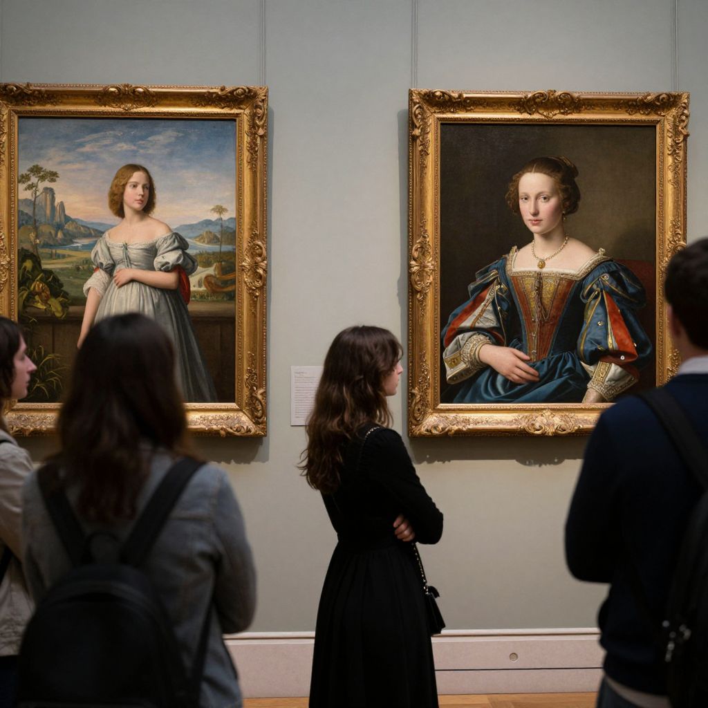 Visitors explore an art gallery, captivated by ornate gold-framed portraits that depict serene landscapes and elegant figures, while a woman in a black dress stands contemplatively before a vivid painting of a woman in Renaissance attire, her gaze meeting the viewer's.