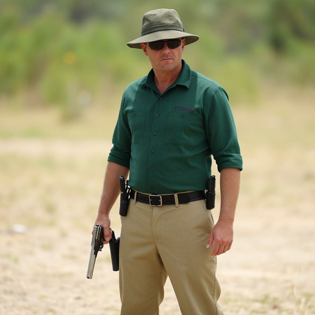 Man in green shirt and khaki pants holding a gun and wearing a hat.