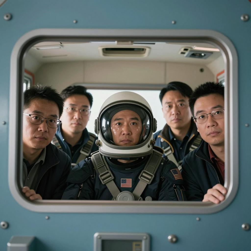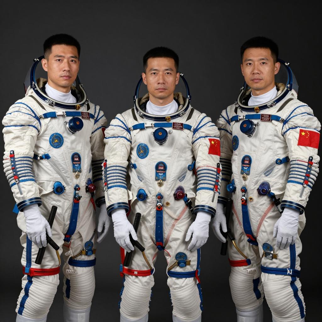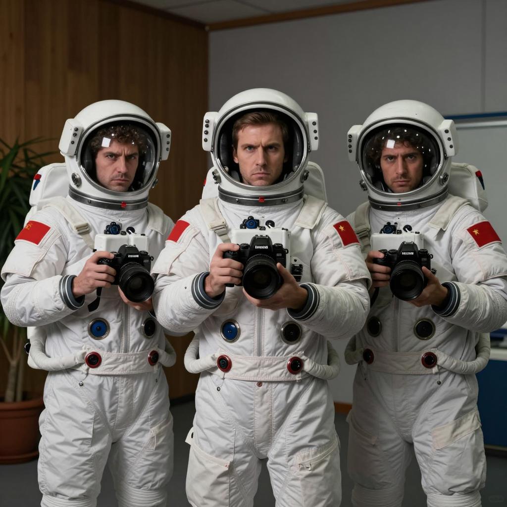 Three men in space suits stand on a stage, holding firearms. The left man with glasses points upward, the middle man looks forward, the right man smiles. Green stage lighting in the background. All wear helmets with attached comms devices.