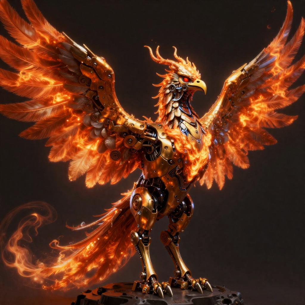 A hyper-detailed digital painting of a cybernetically enhanced rabbit with glowing orange eyes and mechanical metal components integrated into its head and ears. The artwork features a futuristic and high-tech aesthetic, highlighting the fusion between organic rabbit features and advanced robotics, with a dark background emphasizing the bright mechanical elements.