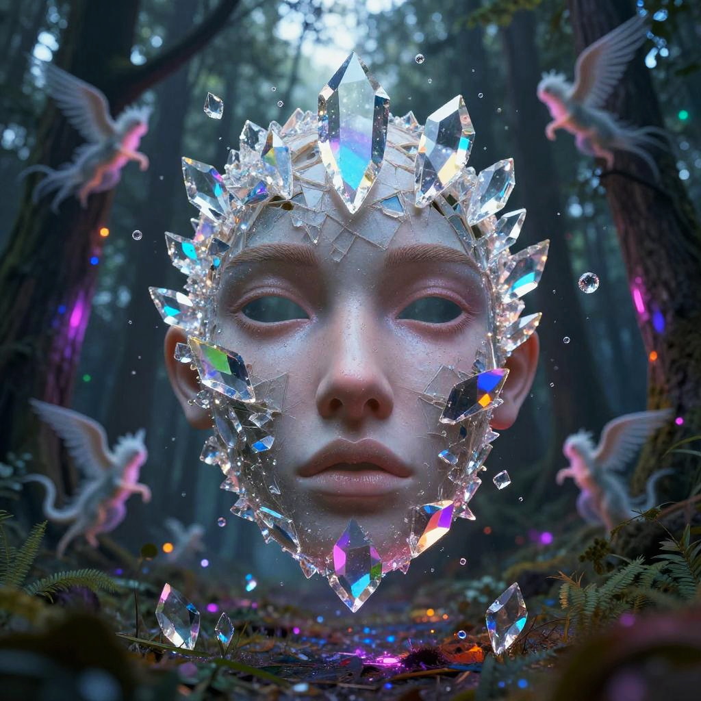 Surrealism ideas generator showing a fragmented face made of crystal shards floating above a neon-lit forest, with vivid colors reflecting in the shards and ethereal creatures moving between the trees, blending fantasy and futuristic aesthetics in a surreal environment.