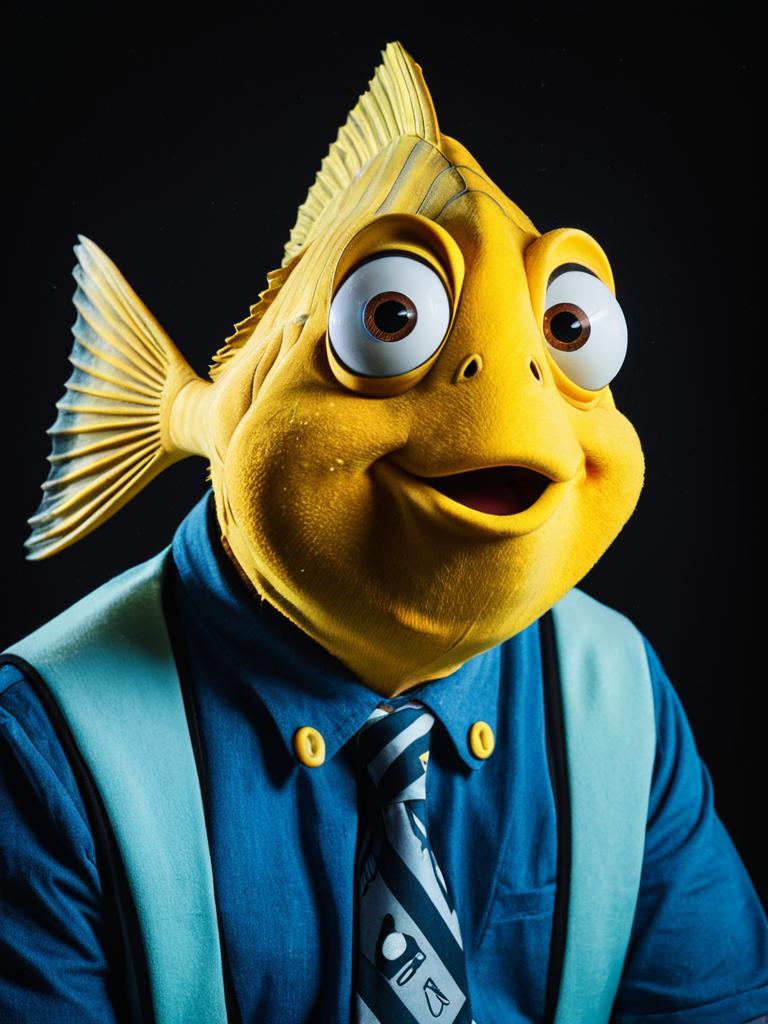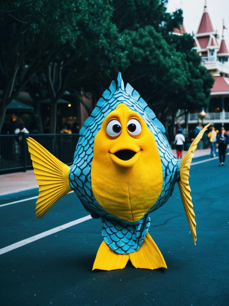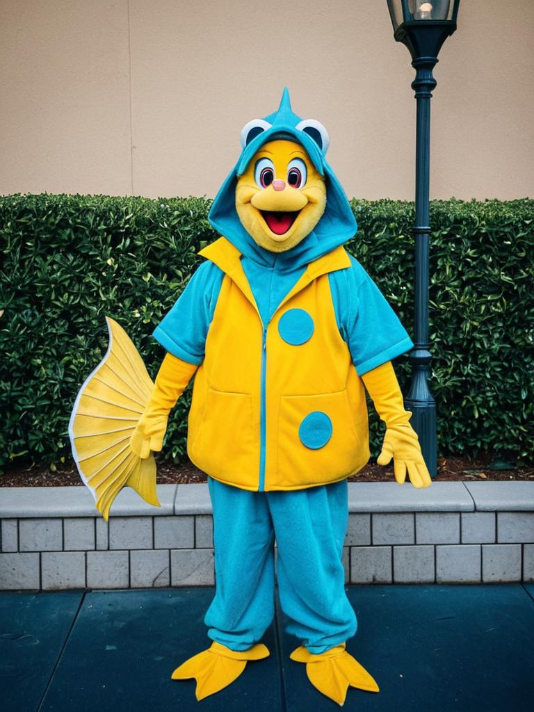 Man in Disney Flounder costume, cosplay editorial portrait, cinematic realism