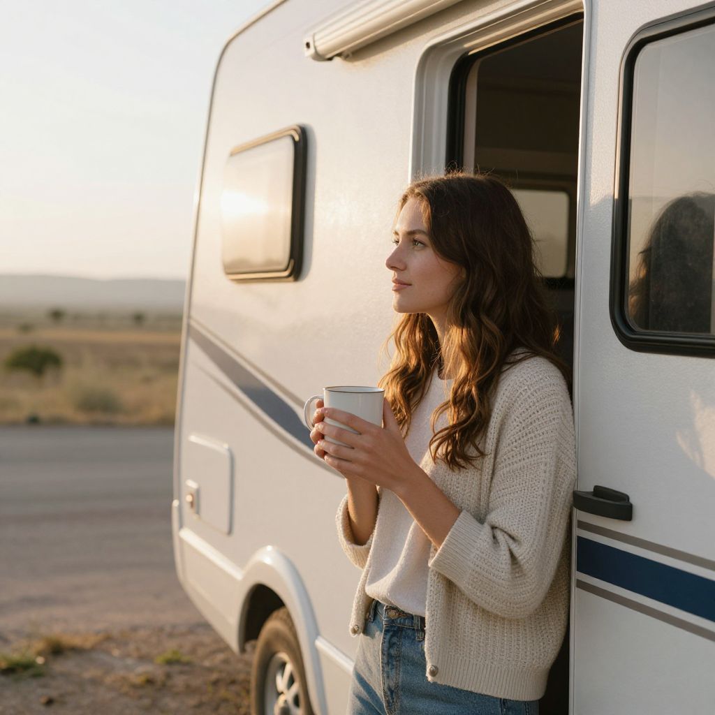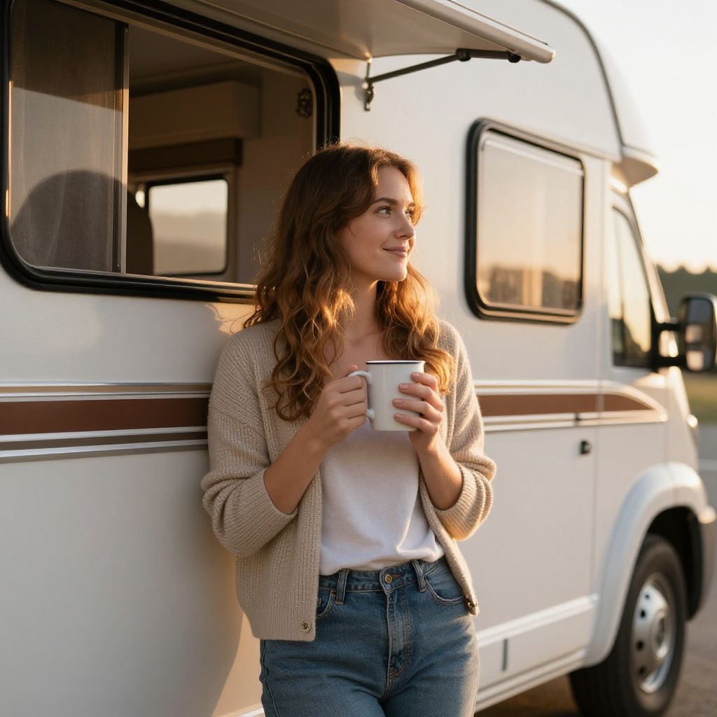 Embracing the warmth of a new day, a woman stands by her camper RV, cradling a mug of coffee—a symbol of comfort and freedom, as the soft morning light bathes her in serenity and the promise of open roads ahead.