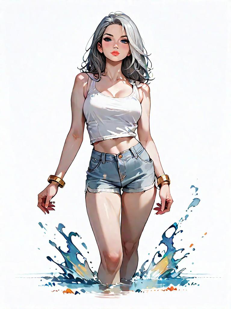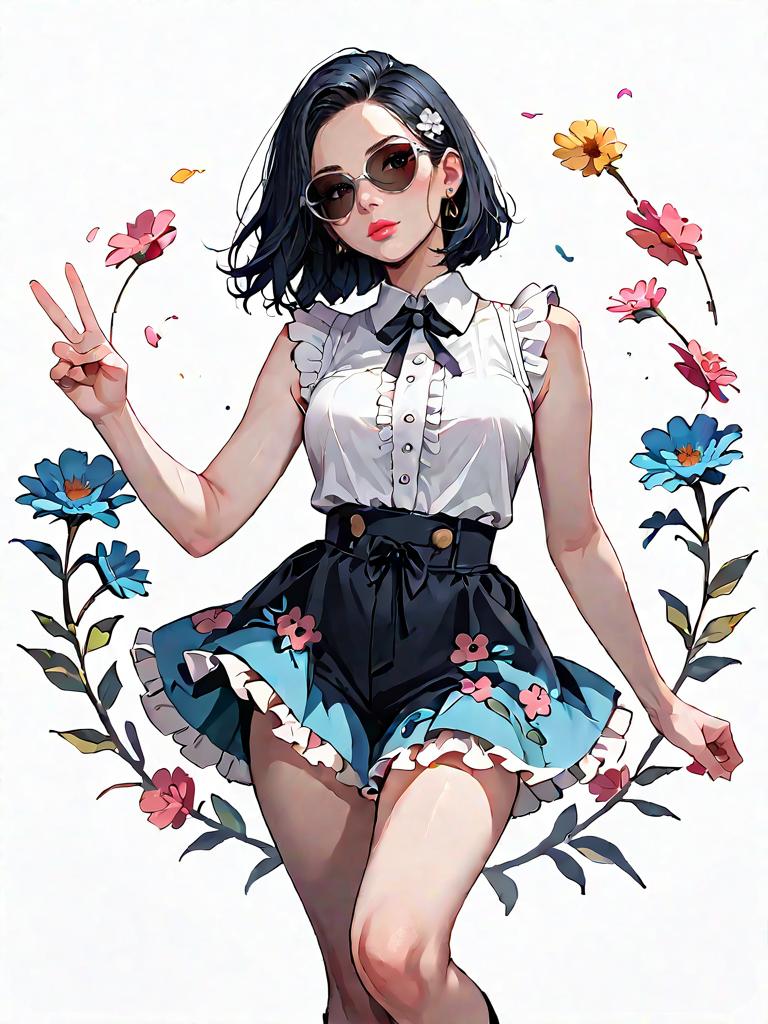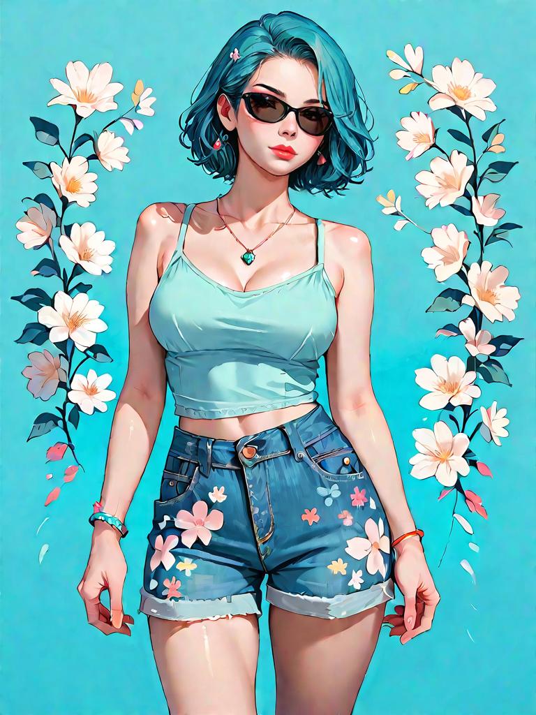 1girl, source_comics, realistic face, full body shot, Woman, casual, sleeveless printed top with a high neckline, pastel-colored abstract patterns, frayed hem, paired with solid brown shorts with lace-up side detail, round oversized sunglasses, chunky arm cuff bracelet.