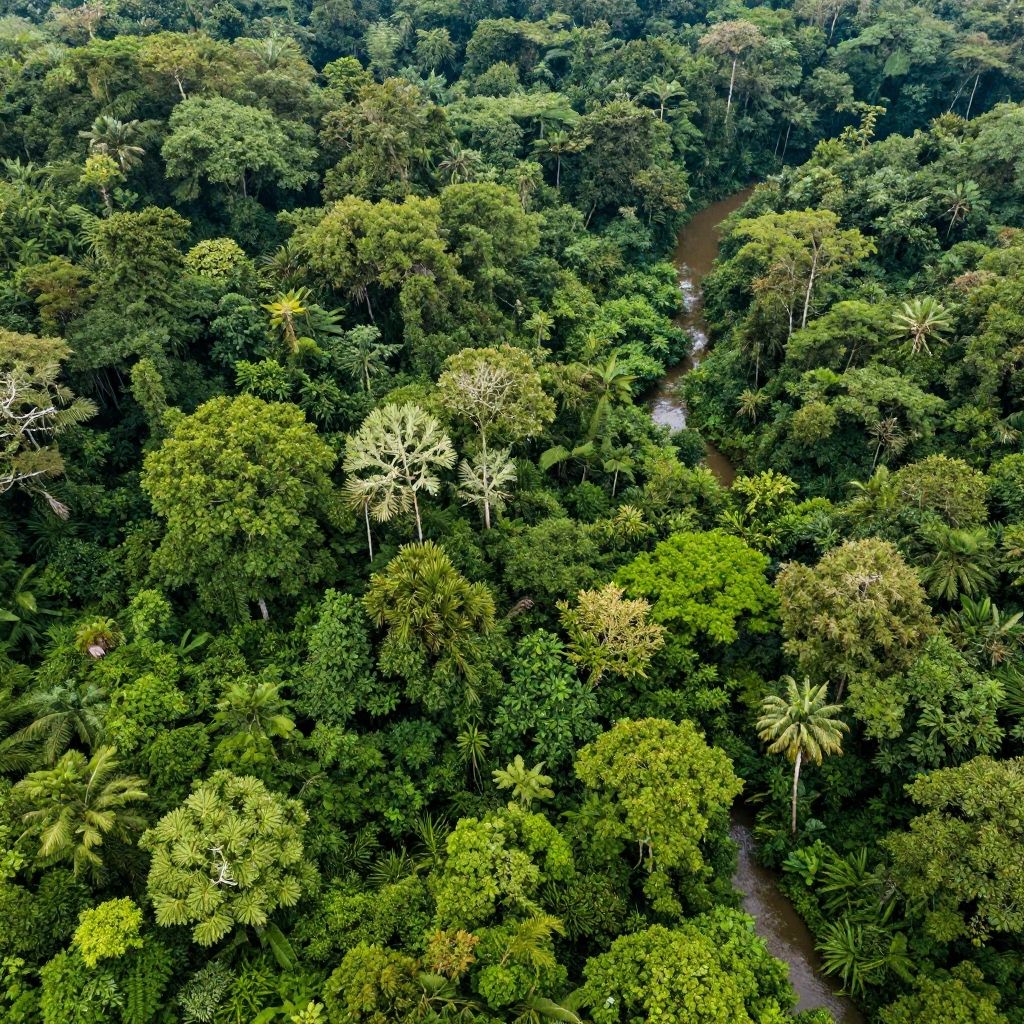 Top down view of a dense tropical rainforest, lush green canopy, winding rivers, scattered animals visible, sunlight filtering through leaves, detailed textures, vivid natural colors