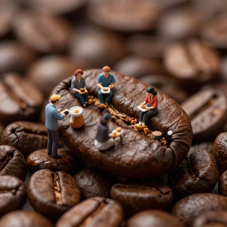 Photograph of tiny people on a coffee bean, gathering around a table with coffee cups and snacks, surrounded by more coffee beans.