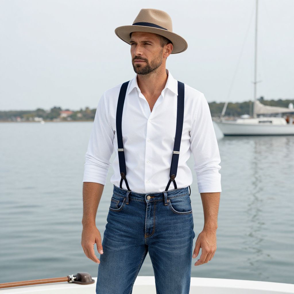 A stylish man stands confidently near the water, dressed in a white shirt with navy suspenders, blue jeans, and a tan fedora hat. The calm waterfront backdrop and a boat in the distance evoke a relaxed, nautical vibe perfect for a casual boat cruise or seaside outing.