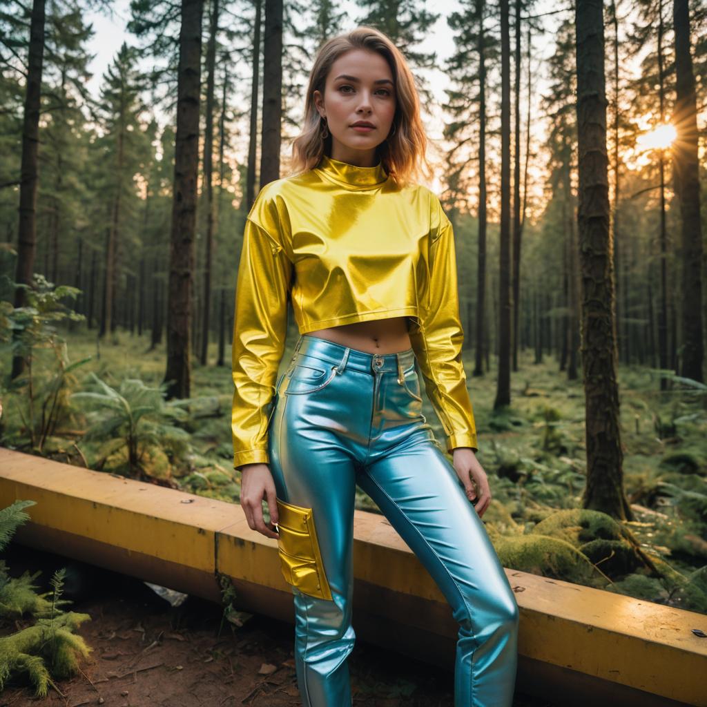Photo of a Rugged Build woman, Side Part, y2k outfit, futuristic metallic fabrics with Sunshine Yellow crop tops, Cotton-polyester blend low-rise jeans, skinny, bold colors, chunky boots, holographic accessories, silent forest, snapshot photography.