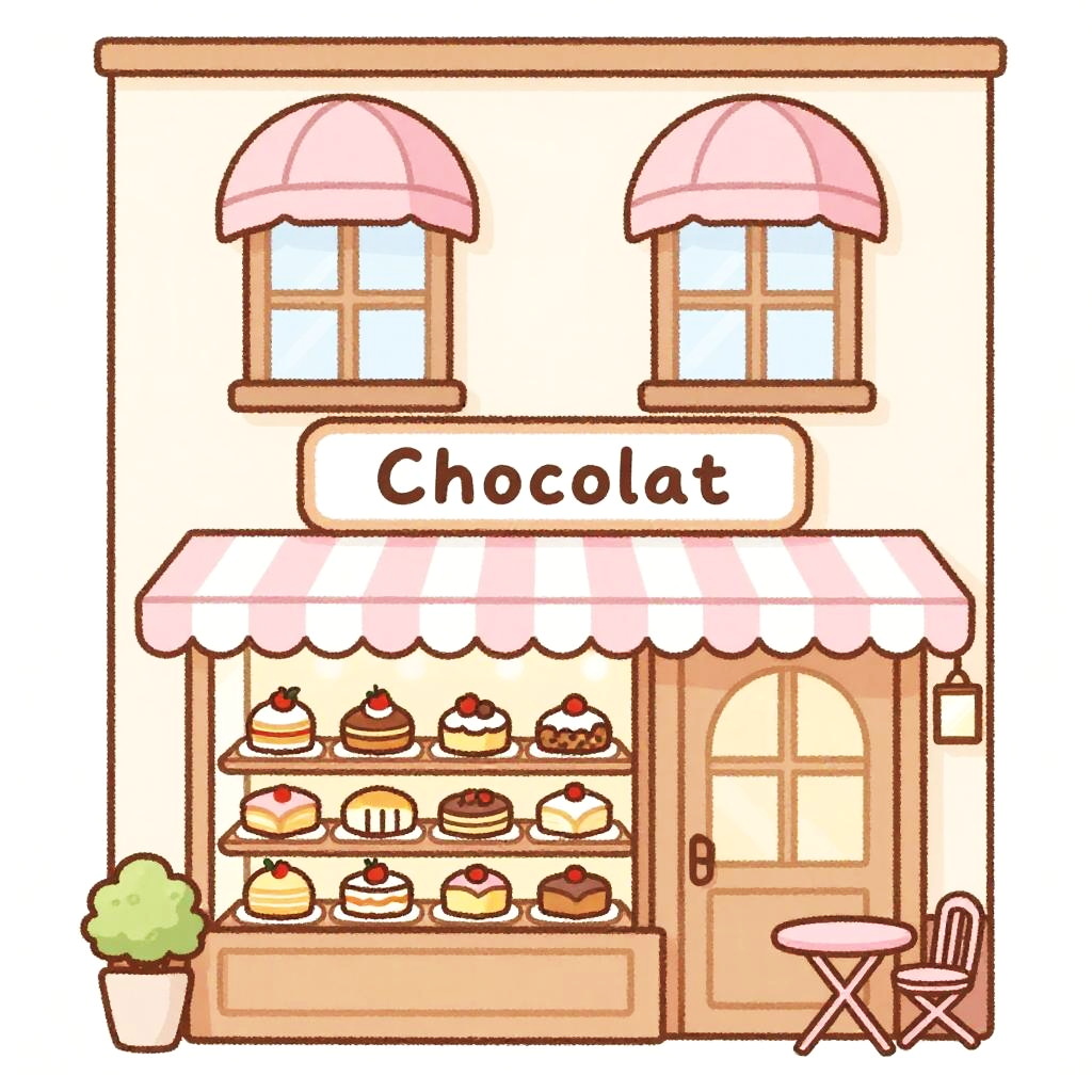 This is a digital drawing of a cute, pastel-colored bakery. It has a two-story facade with pink awnings above two windows on the upper floor and a pink-striped awning over the shop window on the ground floor. The sign above reads "Chocolat". The front window displays an array of pastries, and there's a small pink table and chair outside. The style is whimsical and charming.