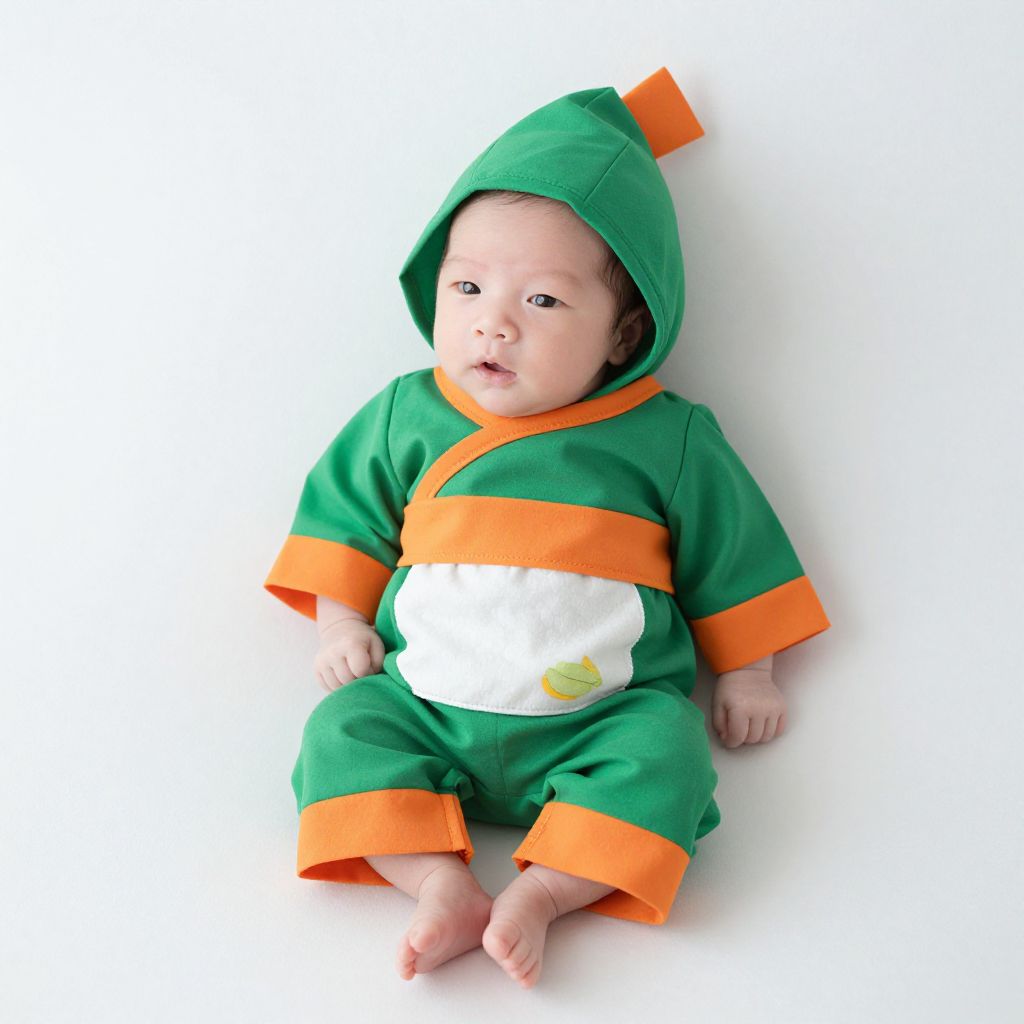 Photograph of a baby sitting on a white surface, wearing a green onesie with orange stripes and orange cuffs, collar, and a small orange point on the hood. The baby has a white diaper with a small yellow design, and their skin is light. The baby's dark brown hair is peeking out from under the hood. The baby has a neutral expression and is looking slightly to the right. The background is completely white, making the baby and their outfit the focal point. The image has bright, even lighting.