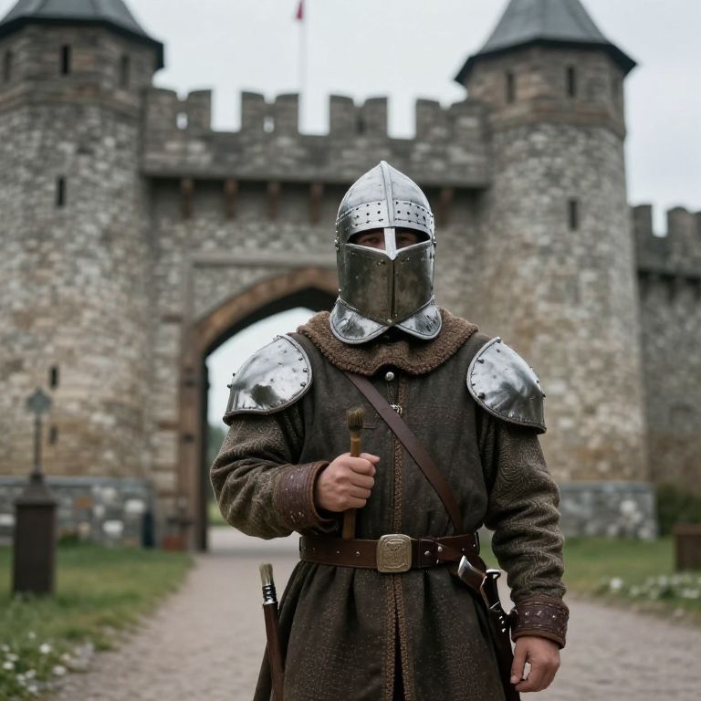 Brush Tool a 12th century kievan rus guard in front of a wooden castle gate :: photorealistic, cinematic, 35mm,
