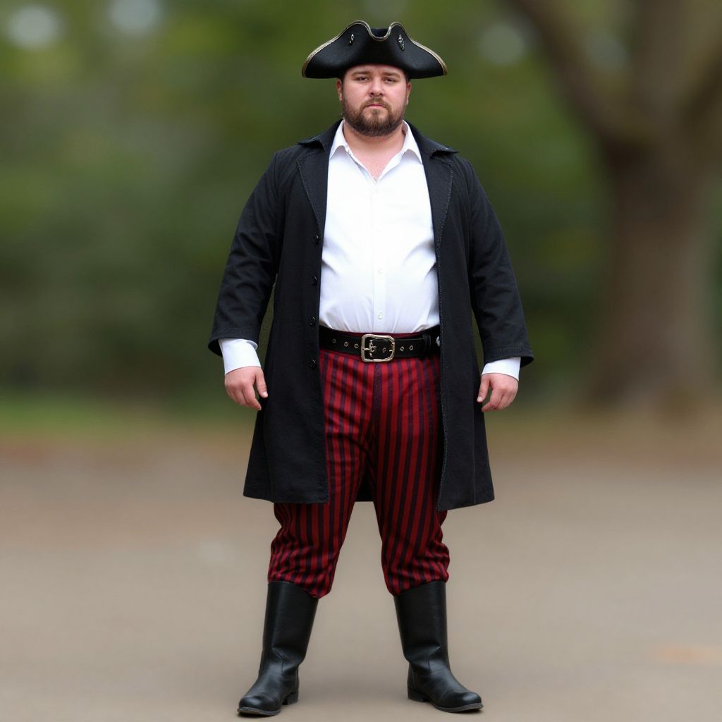 Plus size rum captain man, 1boy, solo, male focus, hat, outdoors, bicorne, black footwear, shirt, white shirt, standing, boots, facial hair, blurry background, pants, full body, blurry, pirate hat, long sleeves, coat, closed mouth, collared shirt, red pants, belt, striped clothes, beard, open clothes, day, jacket, facing viewer, tree, striped pants, open coat