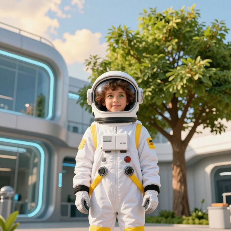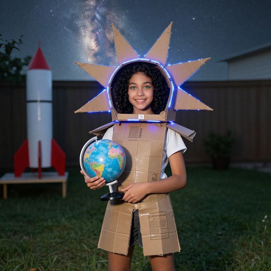 A candid photo of a teenage girl with bright green eyes and curly black hair wearing a handmade space costume featuring a starburst helmet made from cardboard and glowing blue light strips, standing on a grassy lawn at dusk, holding a small planet globe, with a faint outline of the Milky Way in the background and a homemade rocket on a shelf behind her.