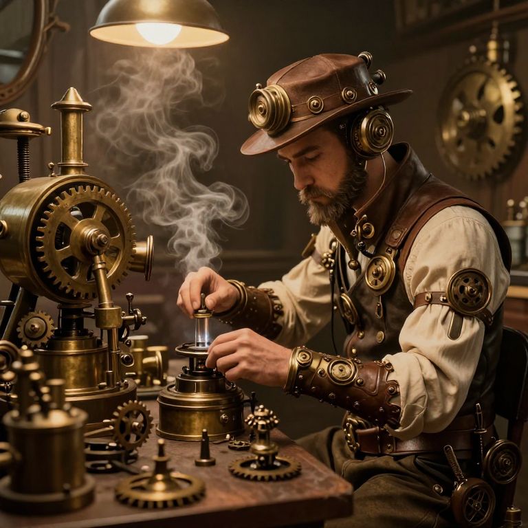 Angg depicted as a steampunk inventor in a vintage workshop, surrounded by brass gadgets and intricate machinery, warm sepia tones with detailed gears, smoke and steam effects, cozy yet industrial environment emphasizing creativity and innovation.
