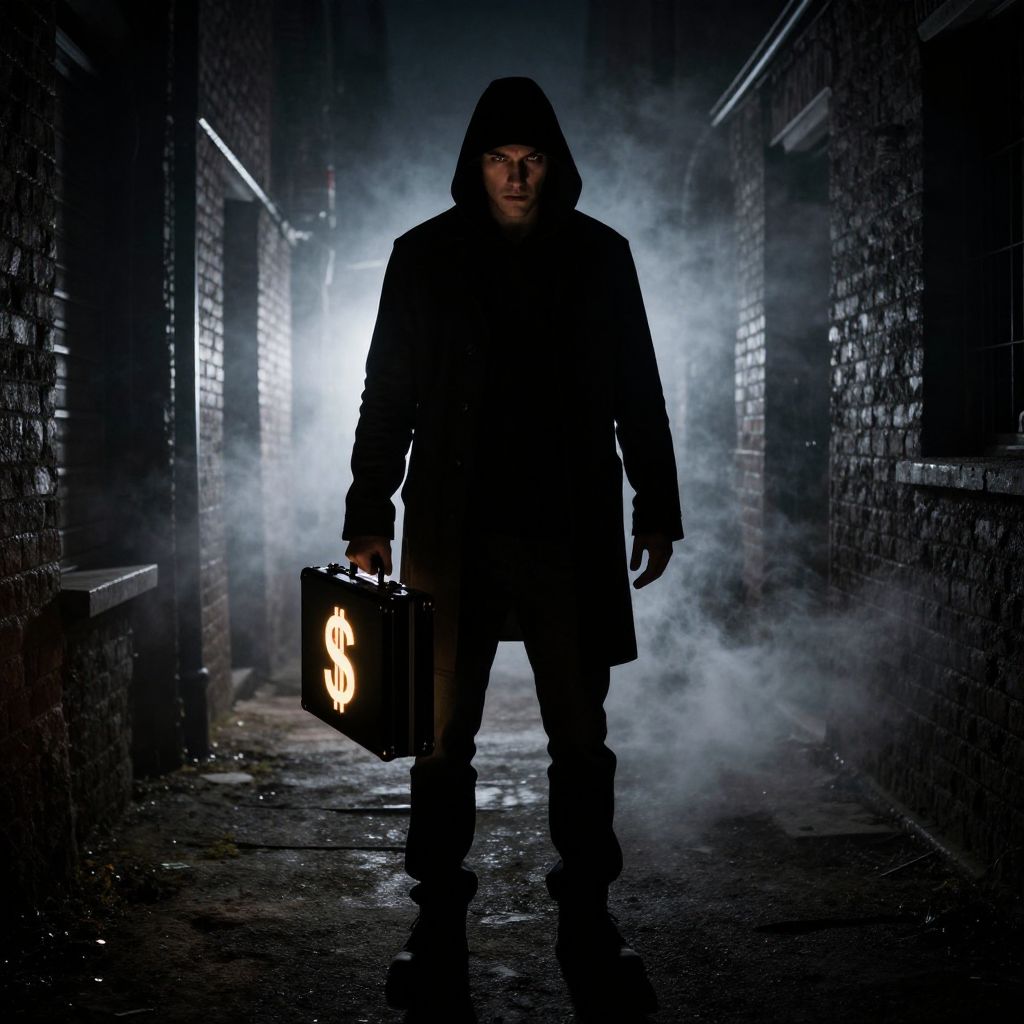 Midnight hour, dark alleyway, fog swirling around feet, mysterious figure emerges from the shadows, clutching briefcase adorned with radiant dollar sign, intense gaze piercing through gloom, moody lighting casts long silhouettes, stark contrast between light and darkness, an air of intrigue surrounds him. Man has masculine face and piercing eyes