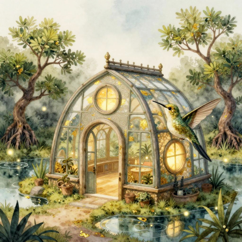 A vibrant, imaginative scene featuring a colossal pearl oyster shaped pavilion set in a tranquil coastal lagoon at dawn with soft morning mist, with round glowing windows and a welcoming arched doorway. The surroundings include delicate sea grasses, weathered driftwood sculptures, gentle rippling water, and scattered seashells; warm highlights, soft bloom, gentle volumetrics, and tasteful bokeh shape a magical, fairytale mood. Render in luminous watercolor with detail and soft gradients with high detail, rich textures, subtle film grain, clean silhouettes, delicate rim light, balanced composition, and a cozy yet adventurous atmosphere.