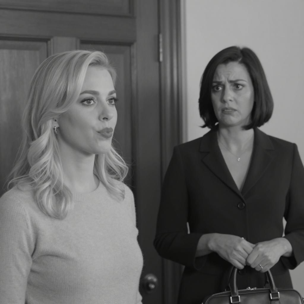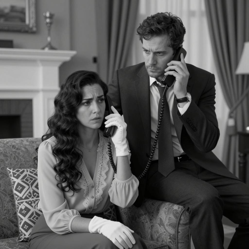 Black and white photograph of three people on a tufted couch. A man in a hat and shirt, a blonde woman in a black dress holding a phone, and a woman in a striped top and high-waisted skirt. Ornate background, large jars on the right. The blonde woman's mouth is open, talking on the phone.