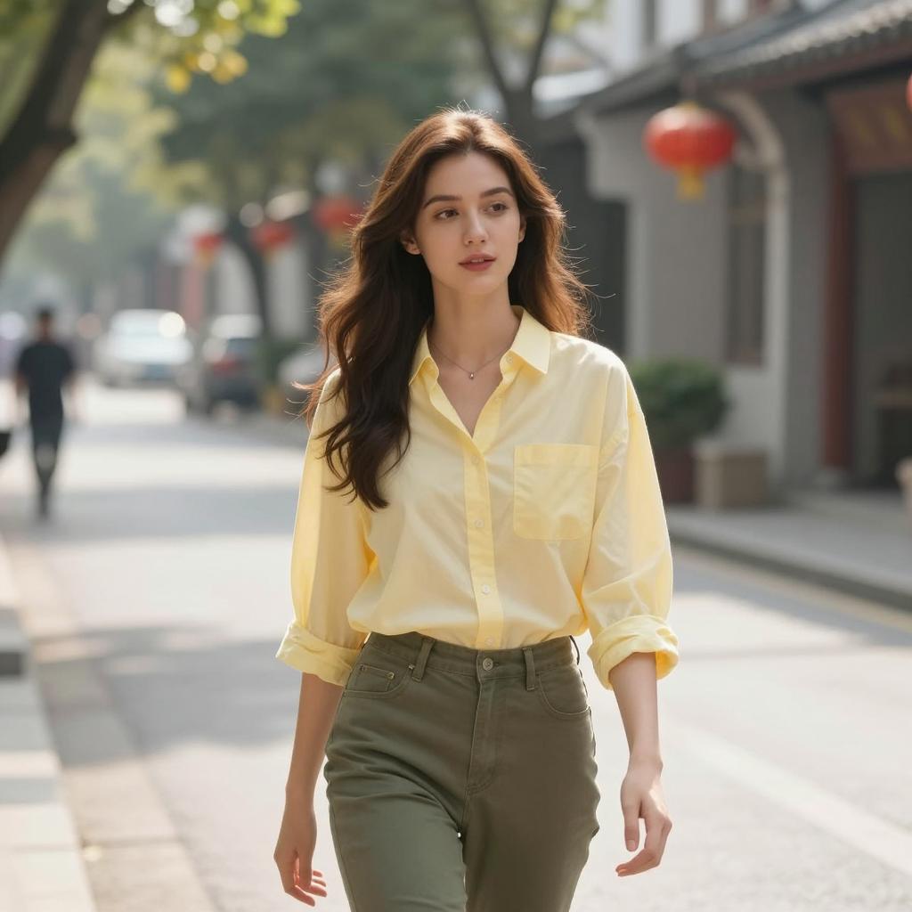 Picnic attire woman, photorealistic, young woman with long brown hair, fair skin, sitting on a blanket in a park, wearing cream blouse with brown buttons and high-waisted beige skirt, wicker basket with yellow lemons behind her, bright sunlight, green trees in background, slightly blurred people in the distance, casual, relaxed, natural light, summer day, soft ures, serene atmosphere