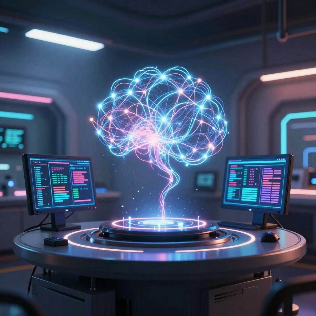 AI art QR code generator in a sleek cyber laboratory, surrounded by holographic screens showing evolving QR codes, neon blue and purple hues, sci-fi atmosphere, highly detailed