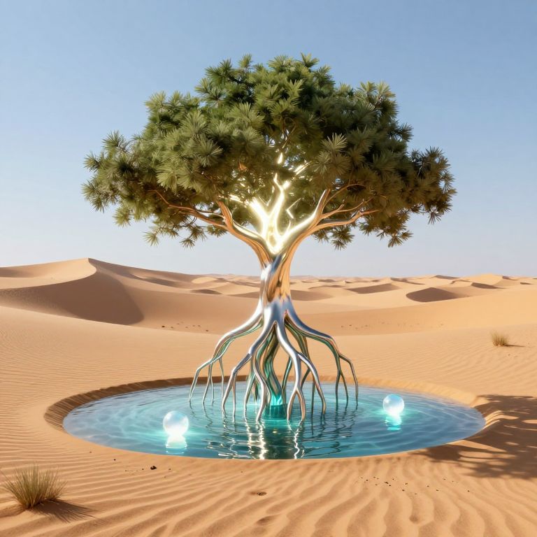 In a surreal 3D-rendered desert landscape, a luminous tree stands inverted, its metallic roots extending into a tranquil oasis where glowing orbs of water defy gravity, creating a mesmerizing interplay of light and shadow.