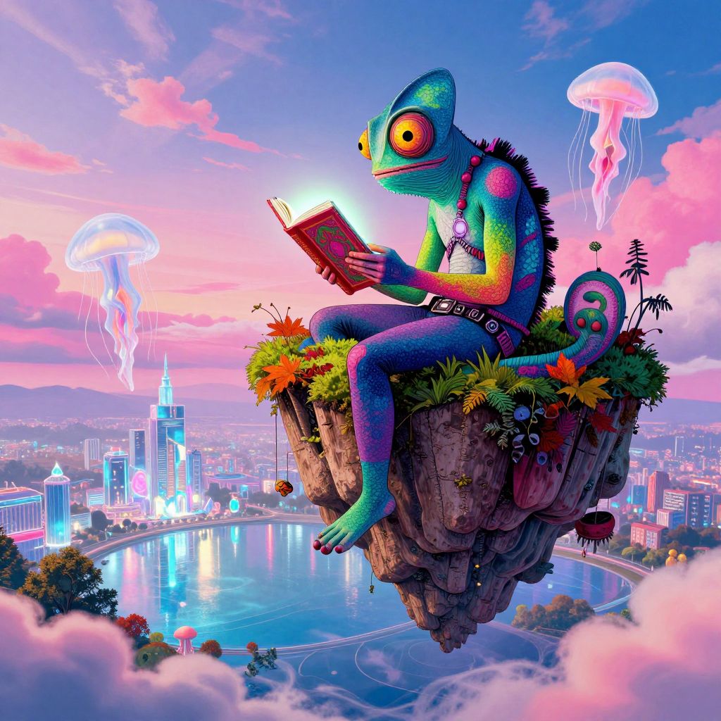 Digital artwork: Vibrant chameleon with large yellow eyes, reading on a floating rock, surrounded by glowing city, jellyfish, and colorful sky.