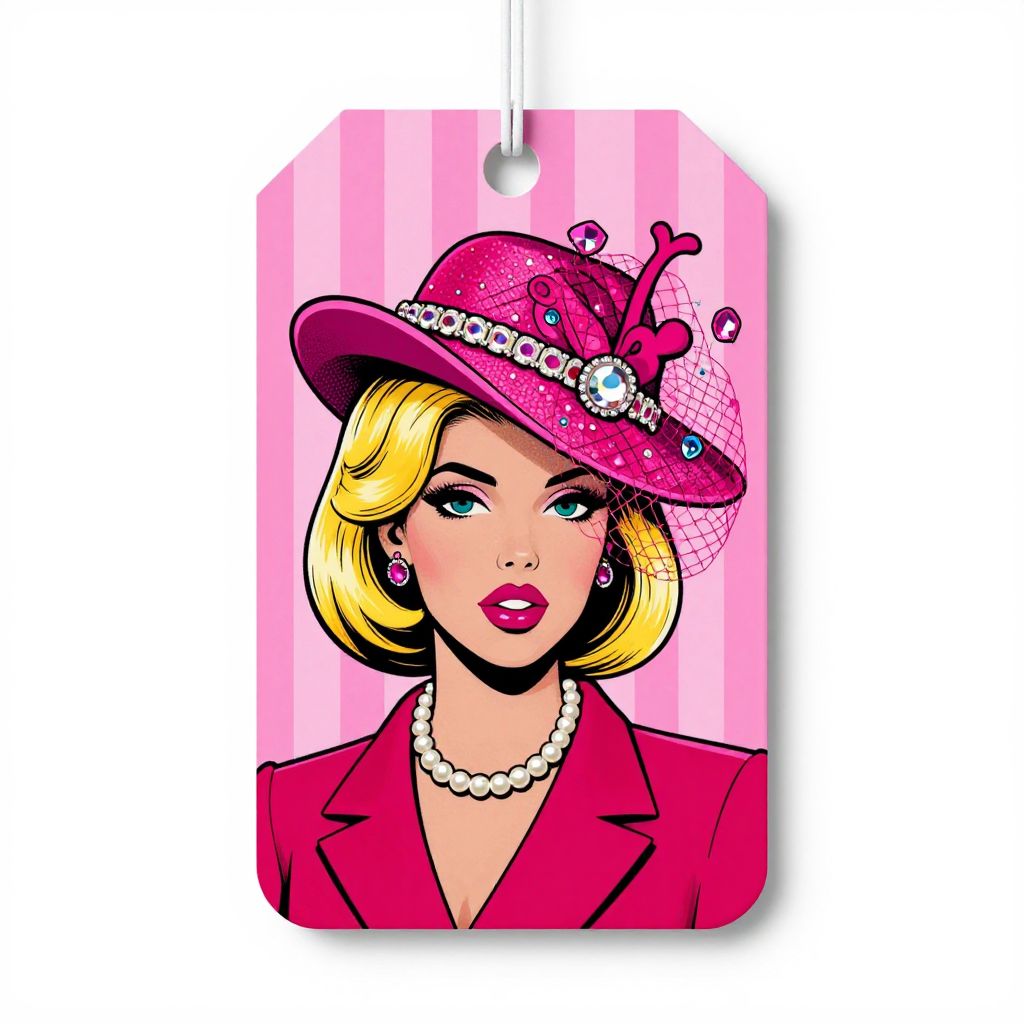 A vibrant pop art-style hanging gift tag featuring a bold illustration of a woman with blonde hair, wearing a hot pink hat adorned with rhinestones and a veil, paired with a matching lipstick-red outfit and pearl necklace, set against a striped pink background with a playful and retro aesthetic.