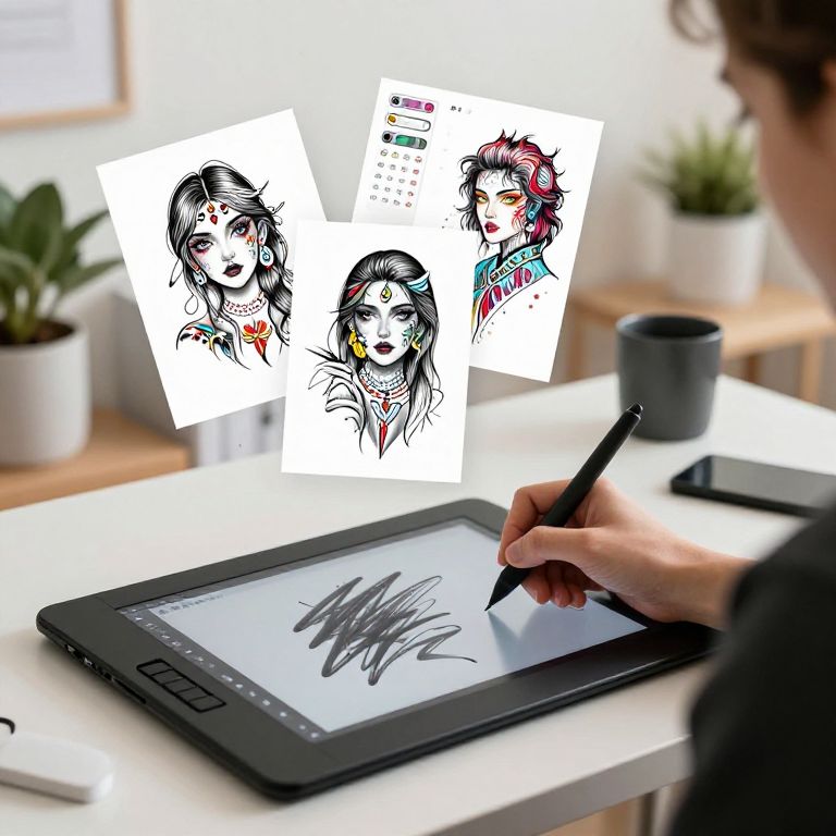 Customize tattoo online free environment showing a person using a stylus on a digital drawing pad, vivid customizable tattoo designs floating mid-air, options for size, color, style selection, dynamic brush strokes visible on screen, cozy minimalist home studio ambiance.