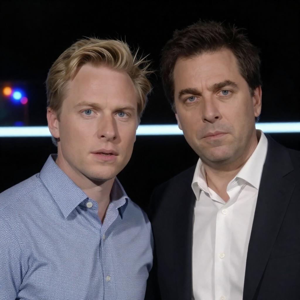 Photograph of two men with intense expressions. The man on the left has blonde hair, blue eyes, light skin, and wears a blue checkered shirt. The man on the right has dark brown hair, blue eyes, light skin, and wears a black blazer over a white shirt. They are positioned closely together, slightly blurred by a horizontal light beam. Dark background with multicolored lights in the distance.