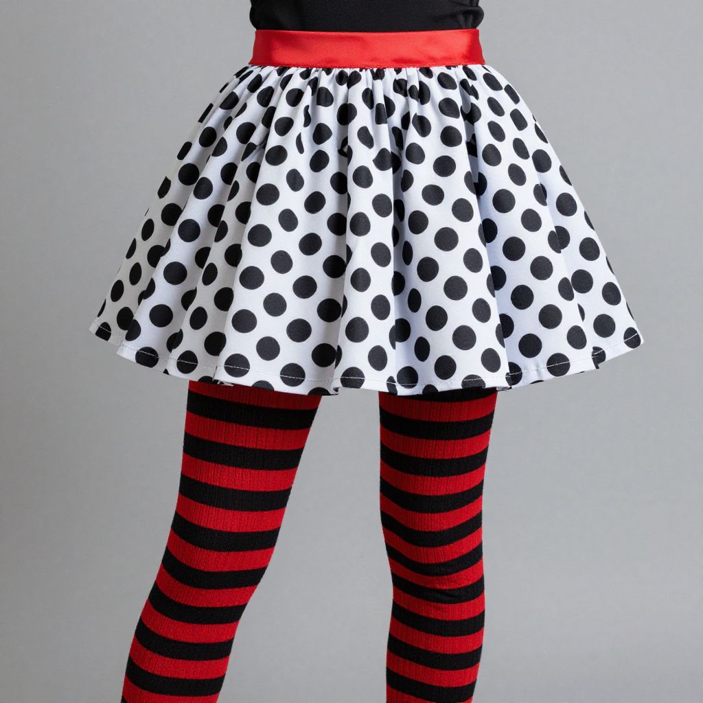 Halloween costume with black and red striped leggings and a black and white polka dot skirt with a red belt