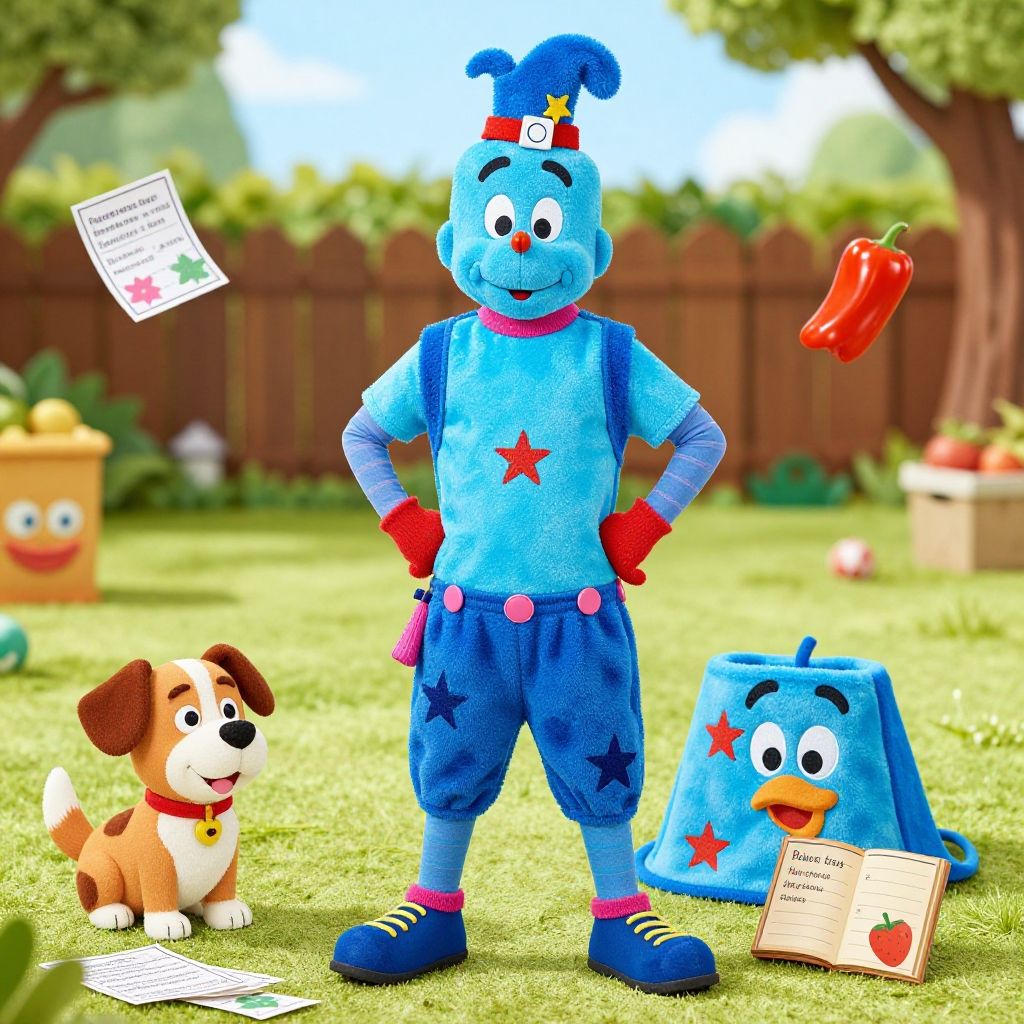 Salt pepper and paprika Blues Clues costume, vibrant and playful outfit inspired by the iconic children's show character, featuring bright blues, playful patterns of spices, whimsical accessories, set in a sunny backyard with a friendly dog and colorful clues, cartoon style.