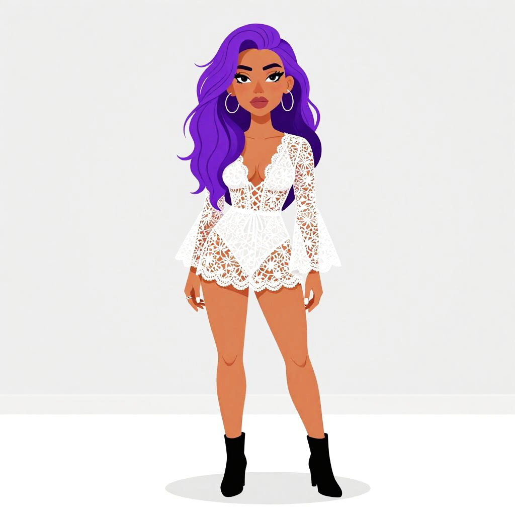 Woman with pretty face and pretty hair. Woman, modern summer chic, white crochet knit two-piece set, strapless tube top with scallop trim, matching high-waisted shorts with scallop hem, fitted silhouette, neutral makeup, long wavy hair, plain white studio background. --sref 1467