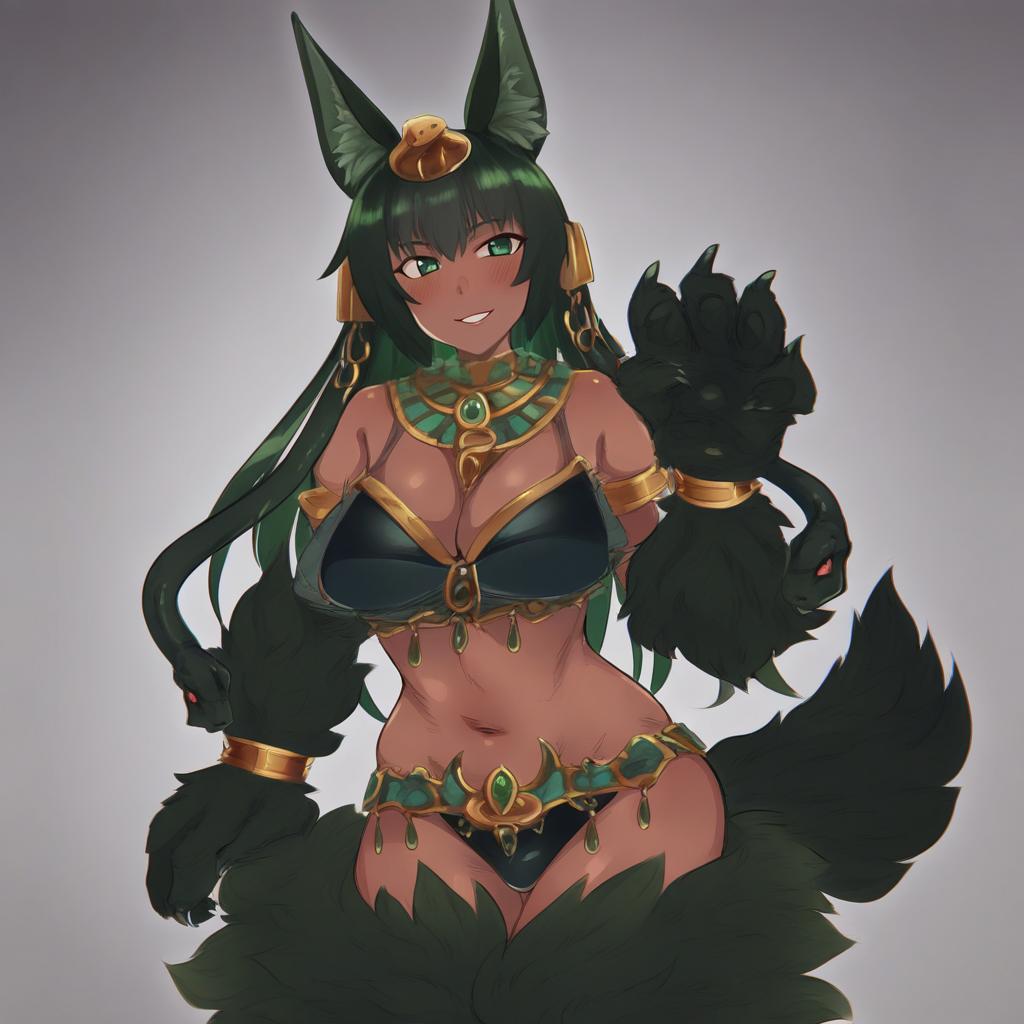 Anubis (monster girl encyclopedia), monster girl encyclopedia, 1girl, monster girl, dark-skinned female, wolf ears, wolf tail, tail, jackal ears, red eyes, green eyes, long hair, green hair, black hair, snake hair ornament, large breasts, animal hands, claws, by artist sho-n-d, anime