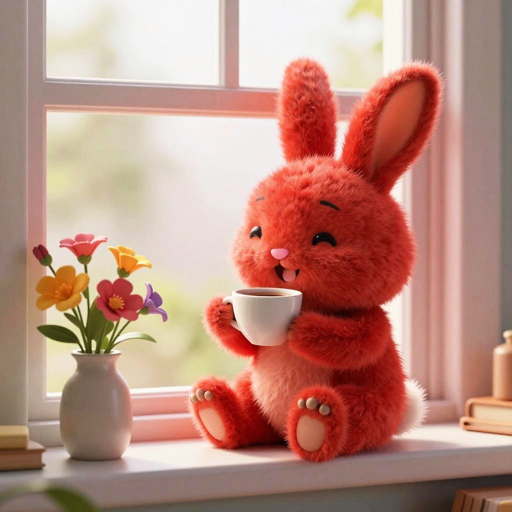 A cute, fluffy red cartoon rabbit sitting on a windowsill next to a cup of coffee and a bouquet of flowers in a vase. The rabbit is smiling and happily drinking coffee, exuding a relaxed, joyful expression. This is a beautiful 3D fantasy drawing with a whimsical style, capturing the rabbit's playful, cool personality in a cozy indoor scene. The art style is bright and vibrant, with fine details and a touch of fantasy.