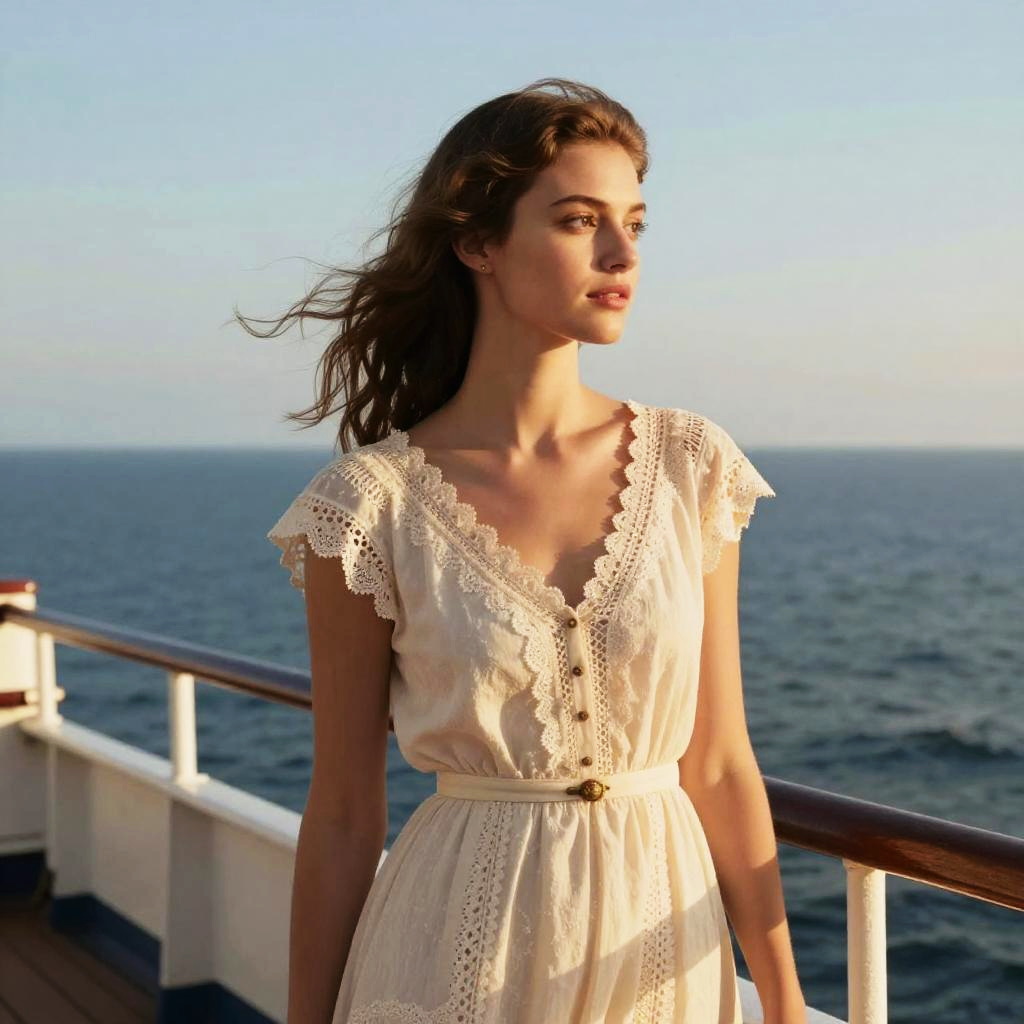 Photograph of a beautiful woman with fair skin and brown, wavy hair standing on a ship's deck at sunset. She wears a cream-colored, vintage-style dress with delicate lace trim and short sleeves, cinched at the waist with a small belt. She gazes into the distance, with the calm ocean and clear sky behind her. Her hair gently blows in the breeze.