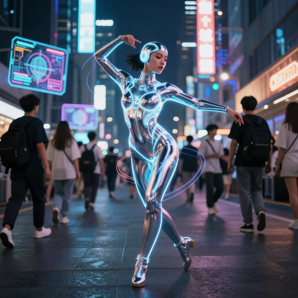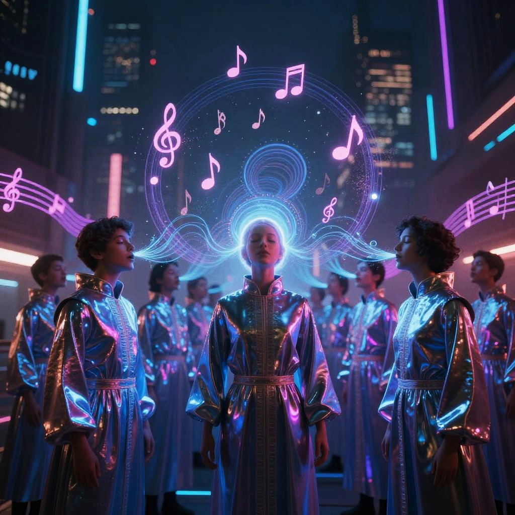 Photograph of a futuristic choir in shiny silver robes, illuminated by neon blue and purple lights, with musical notes floating above their heads in a cityscape