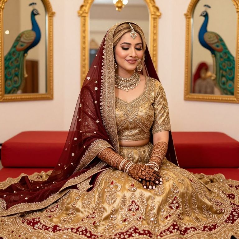 Photograph of a South Asian bride in an ornate gold and maroon traditional wedding attire, seated on a red carpet. She wears a gold embroidered lehenga with a maroon dupatta, matching gold jewelry, and intricate henna designs on her hands and arms. Her brown hair is styled neatly under a headpiece. The background features golden-framed mirrors with peacock motifs, and a red cushioned bench. The bride has a serene smile, closed eyes, and a relaxed posture, exuding grace and elegance. The image is brightly lit, highlighting the rich textures and colors.