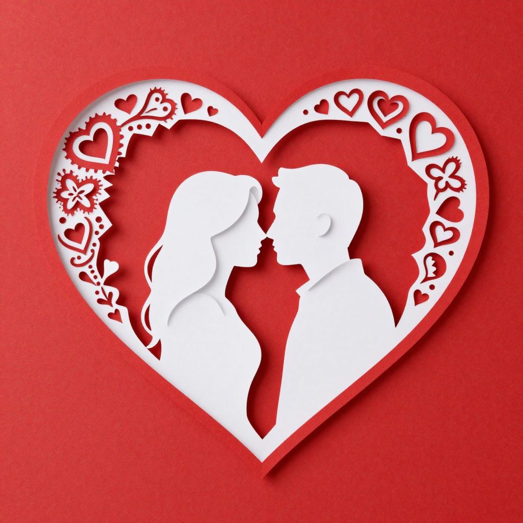 Digital illustration of a white silhouette of a couple kissing, centered within a red heart shape. The heart features intricate, white cut-out patterns of hearts and floral designs along the top and bottom edges. The background is a solid, vibrant red, contrasting with the white silhouettes and cut-out details. The couple's profiles are facing each other, creating a romantic and intimate scene. The overall style is clean, modern, and highly stylized, with a focus on romantic themes and bold colors.