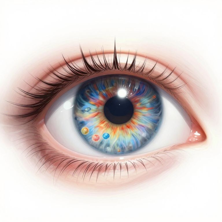 A hyper-realistic digital illustration of an enormous eye, rendered with intricate detail and vibrant hues, features a mesmerizing pupil that swirls with miniature universes, set against a stark, chalk-white background, evoking a surreal and otherworldly visual effect.