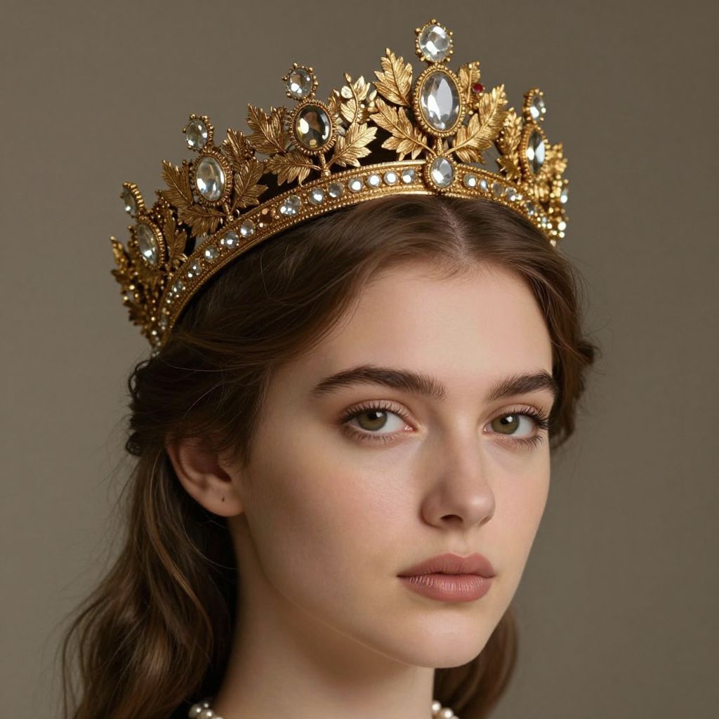 A woman adorned with a regal gold crown featuring intricate leaf designs and sparkling gemstones exudes a vintage elegance, reminiscent of classical artistry and high-definition craftsmanship.